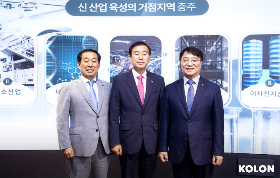 (왼쪽부터 코오롱인더스트리 제조부문 장희구 대표이사, 조길형 충주시장, 코오롱글로벌 김정일 대표이사)